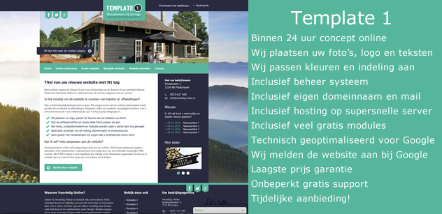 Professionele website inclusief domein, hosting en e-mail accounts. Onze grafisch ontwerpers passen de website binnen de mogelijkheden van de template aan aan jouw wensen. Wij plaatsen je logo, passen de kleuren aan maar aan nog veel verder dan onze concurrenten. Wij zorgen ervoor dat aangeleverde teksten, afbeeldingen, video's etc. geplaatst worden. Tevens maken we het menu systeem, plaatsen formulieren en melden de website aan bij Google. Met een website van Voordelig Online hoef je zelf niets te doen!